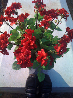 The vase came in last week and they mounted it on the vault. You can barely see it but it is a cross shaped vase on all four sides. It wasn't until I got away that I realized I did not get a good picture of the vase. I was enamored with the fact that I could sit on my grandmother's tombstone and rest my feet on my son's vault. I don't think she would mind. :) Three times up there and I'm just now figuring out how to make myself comfortable! Red geraniums please me to no end, even if they are just silk.